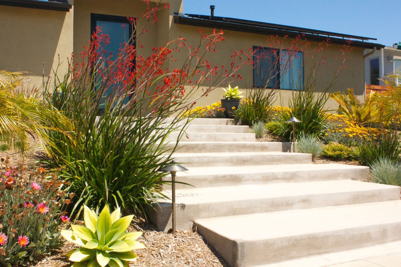 For this newly remodeled home in Carlsbad I designed the concrete entry stairs and used a natural water wise planting palette for softness such as colorful grasses, kangaroo paw, and agaves. Andrea Loosen Landscape Design managed all aspects of the project from the landscape plan to hardscape installation.
