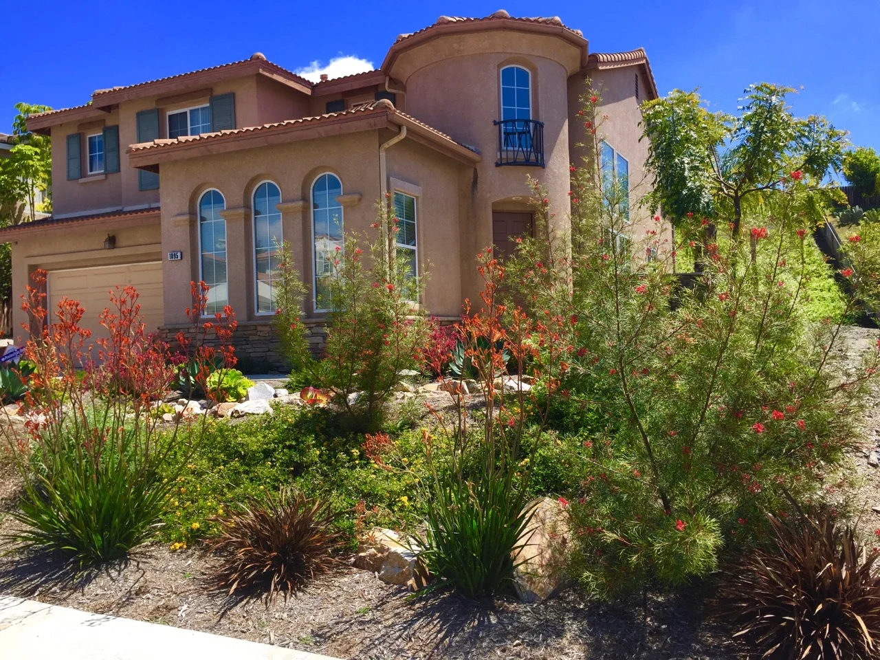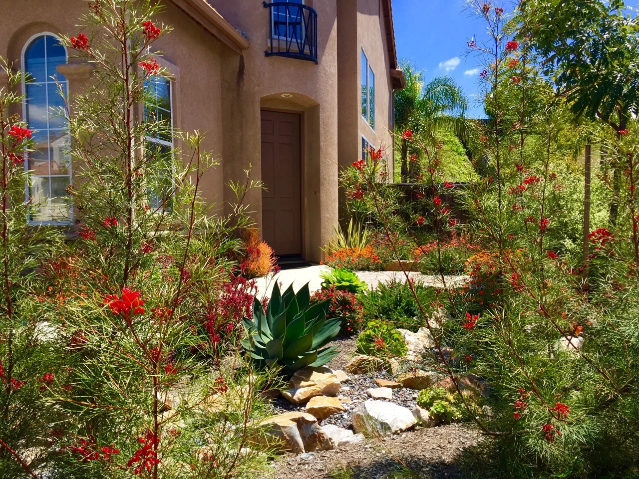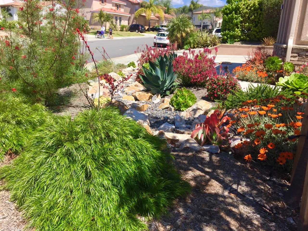 San Marcos - By complying with the new water restrictions, the clients were unable to maintain their lawn in good condition. Our decision to remove the grass, plant drought tolerant plants and install a dry creek allowed them to reduce their water consumption and garden maintenance bills. They now enjoy color throughout the year. Andrea Loosen Landscape Design managed all aspects of the project from landscape plan to installation.