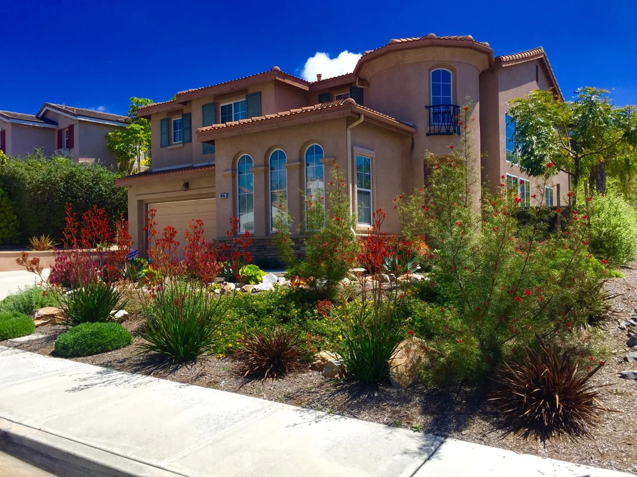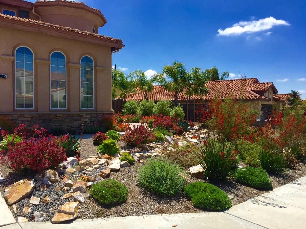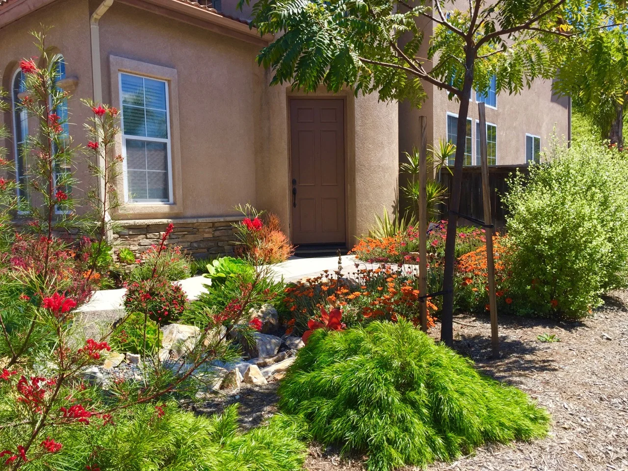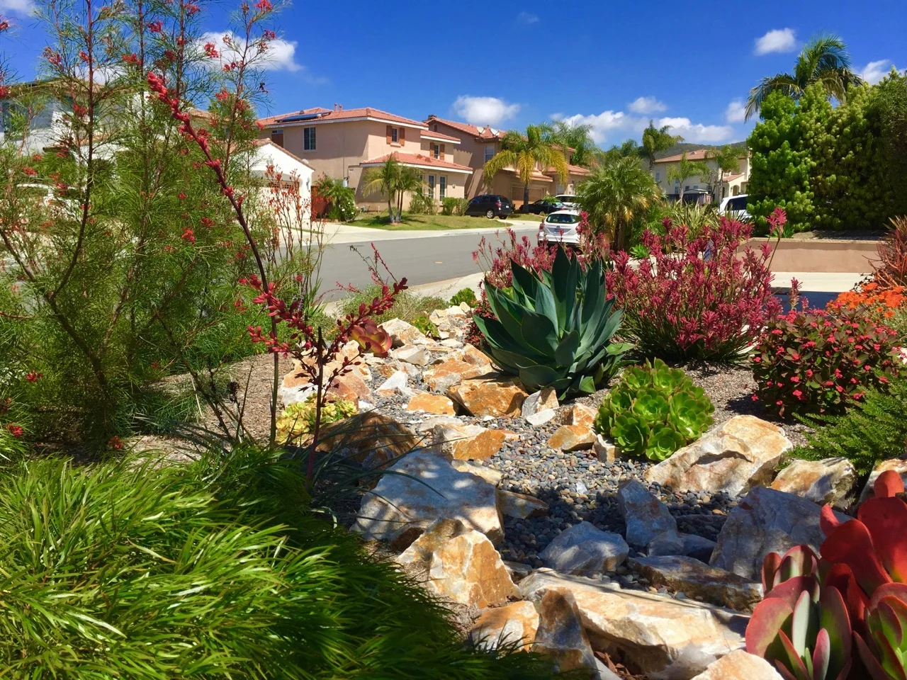 San Marcos - By complying with the new water restrictions, the clients were unable to maintain their lawn in good condition. Our decision to remove the grass, plant drought tolerant plants and install a dry creek allowed them to reduce their water consumption and garden maintenance bills. They now enjoy color throughout the year. Andrea Loosen Landscape Design managed all aspects of the project from landscape plan to installation.